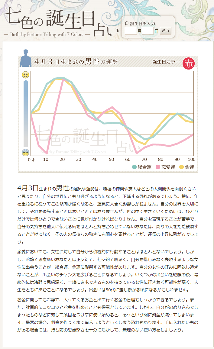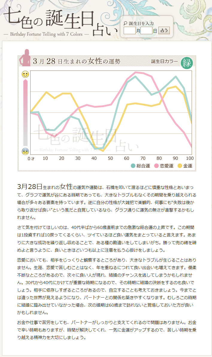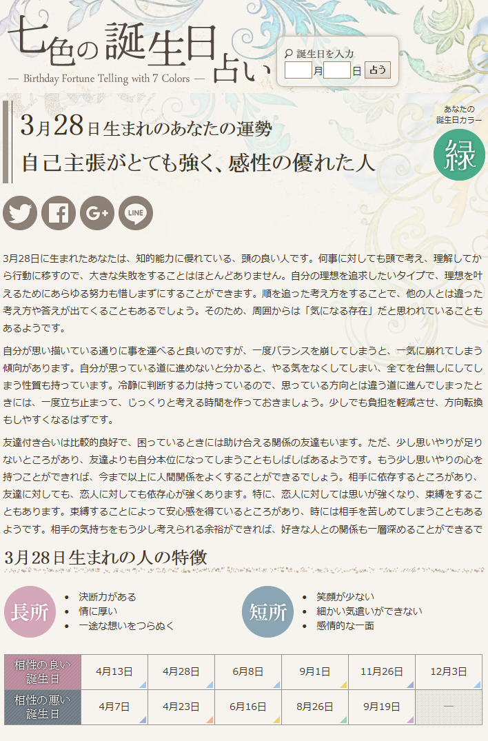 日付は忘れてしまったのですが1年差がいいので3月下旬と4月上旬がいいっていうのだけは覚えてて、改めて3月28日と4月3日に決めたんですけど決めた後に「七色の誕生日占い」というサイトさんを見つけて占ってみました。