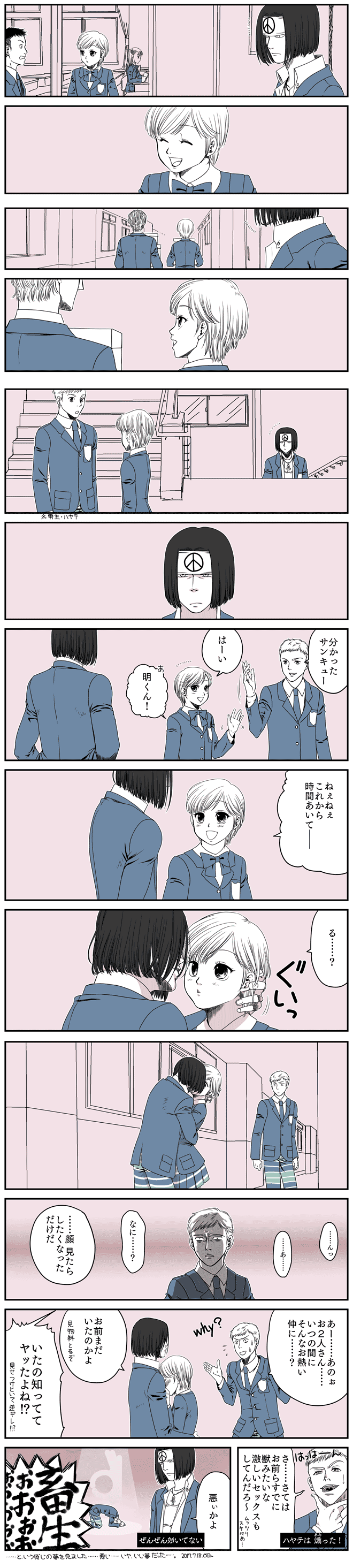 私が見た夢なので、悪意のある見方をすれば若干宮本がストーカーっぽいのとヒロインが男子とばっか話してる尻軽女っぽいのがやや残念ですが、私としては「恋人同士になって1ヶ月くらいの時に偶然にも男子生徒とばかり話をしているユウナを何回も見てしまい嫉妬したというのと、ハヤテの目の前でイチャつけば少し噂が広まって悪い虫が寄ってこなくなるのではないかと考えた」という解釈ですイエーイ。