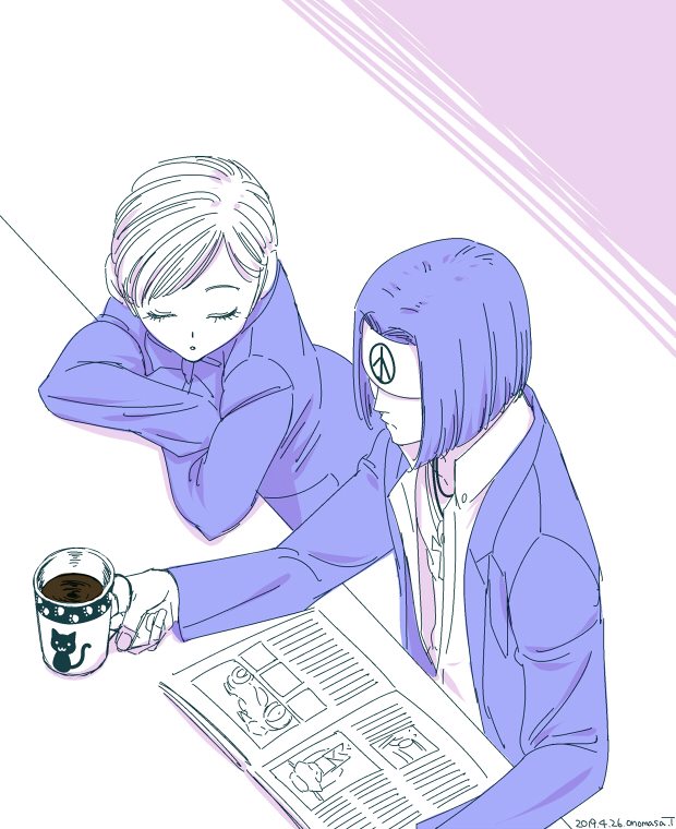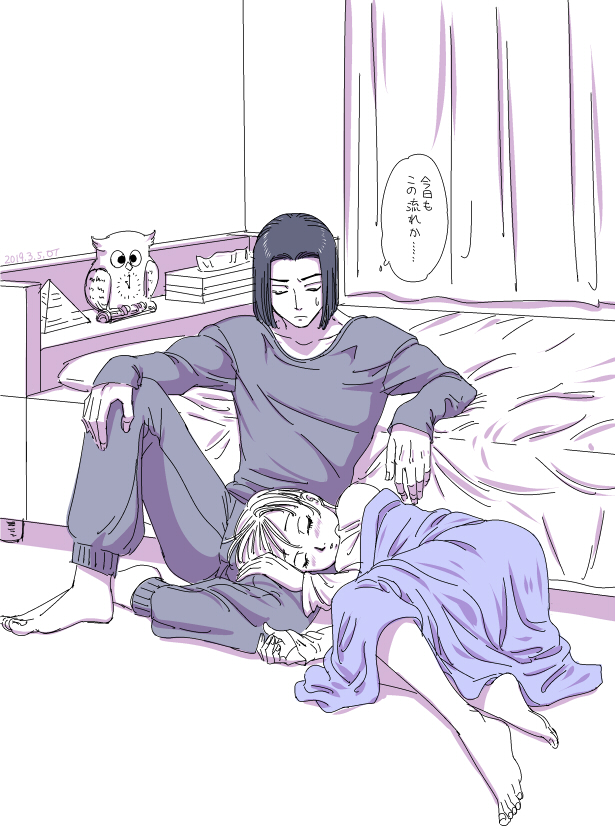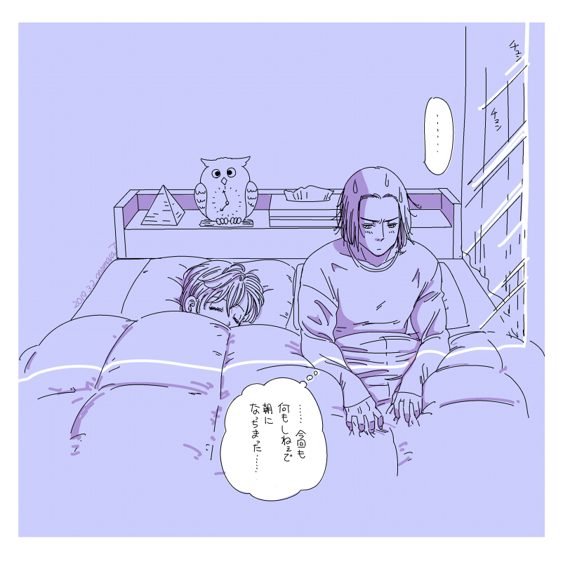 診断メーカーで出たお題(ホラー映画見て眠れなくなって一緒の布団に入ってくだらない話をしてたら寝落ちして朝になってた)でラクガキ。
