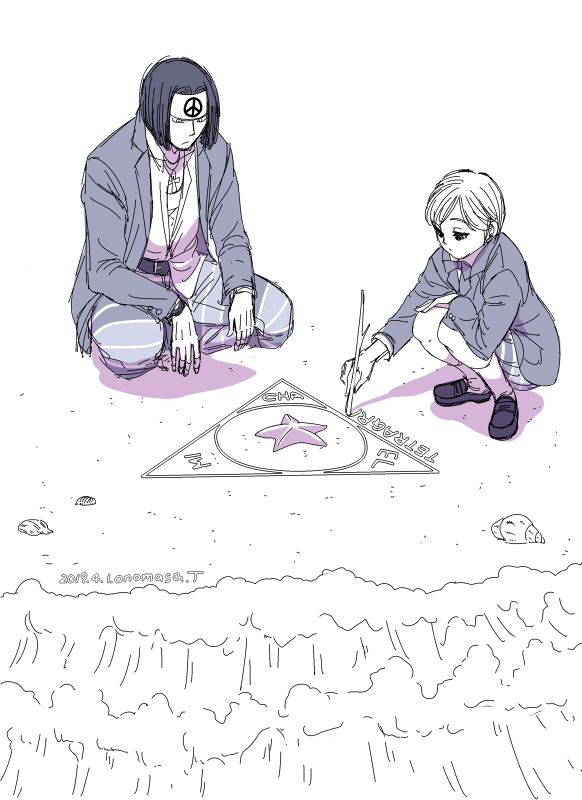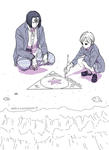 診断メーカーで出たお題(海に行って足先だけつけてみたが冷たいのですぐ上がって砂浜に枝でいろいろ書いてみる)でラクガキ。